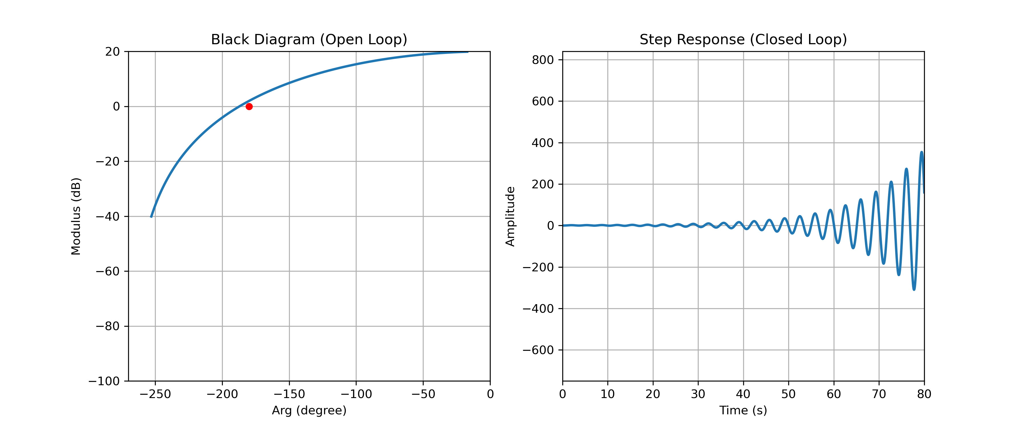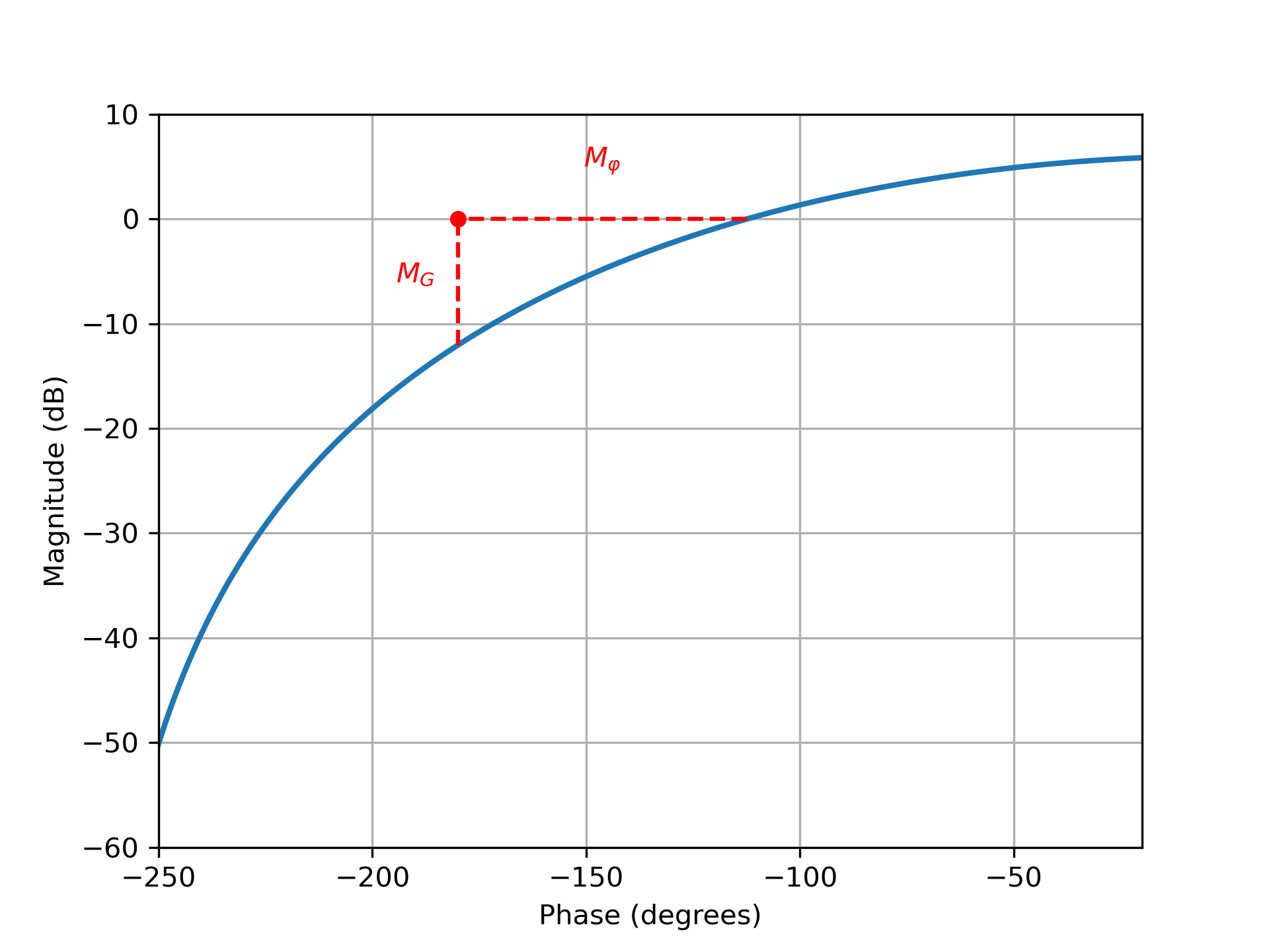 A titre d'exemple, la figure ci-dessus présente le lieu de Black d'un système de 3ieme ordre. Ce système est stable en boucle fermée. Concernant les marges, nous obtenons une marge de Gain