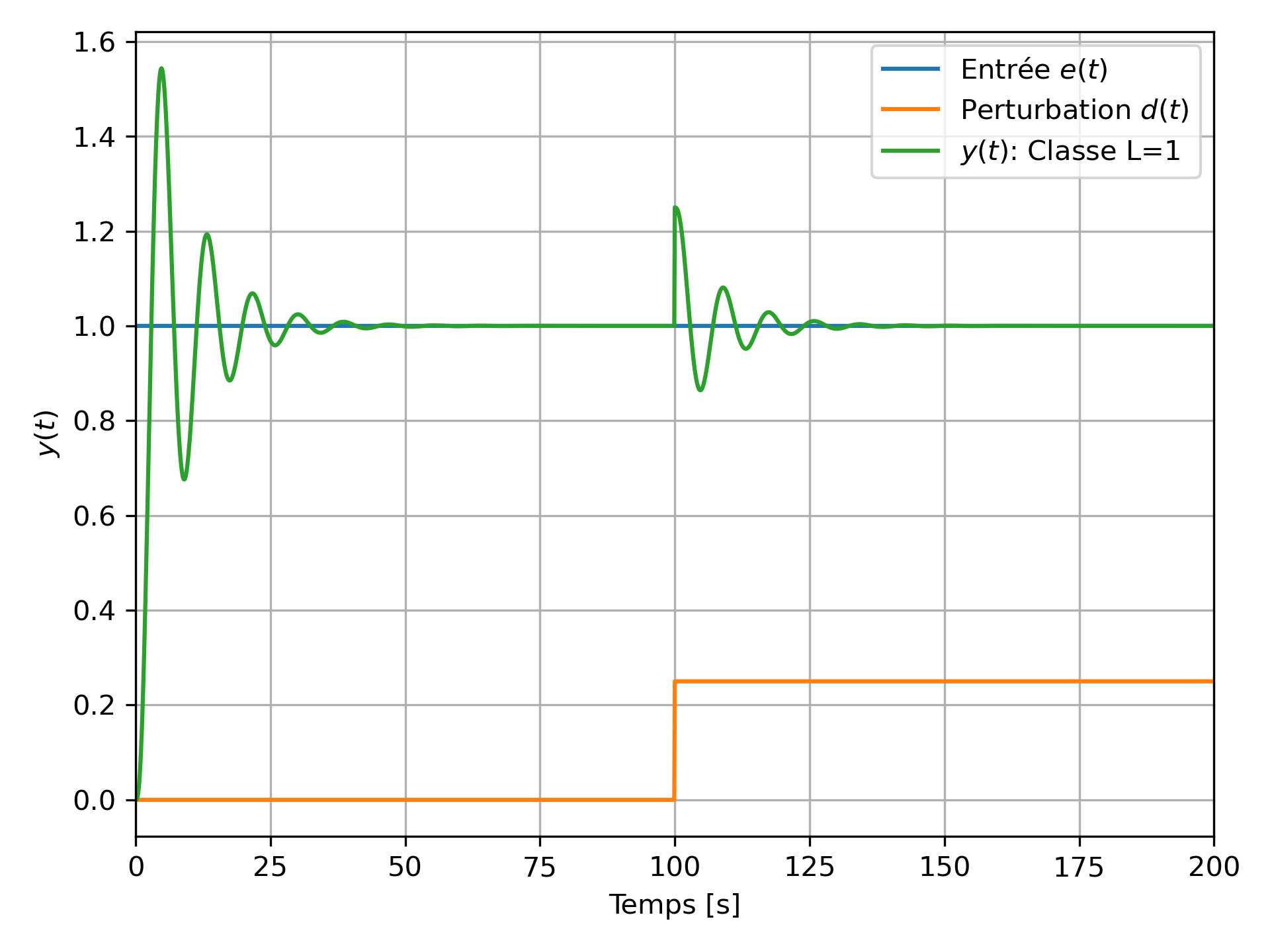 Dans de nombreux systèmes réels, des perturbations extérieures peuvent affecter les performances du système bouclé. Pour obtenir un système robuste, il est nécessaire de limiter l'impact de ces perturbations sur la sortie. Dans cette section, nous nous focalisons sur le cas classique où la perturbation