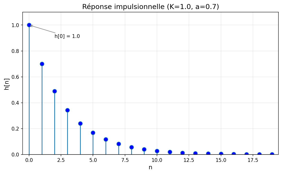 Pour un pôle positif, la réponse impulsionnelle décroît de manière monotone vers zéro :