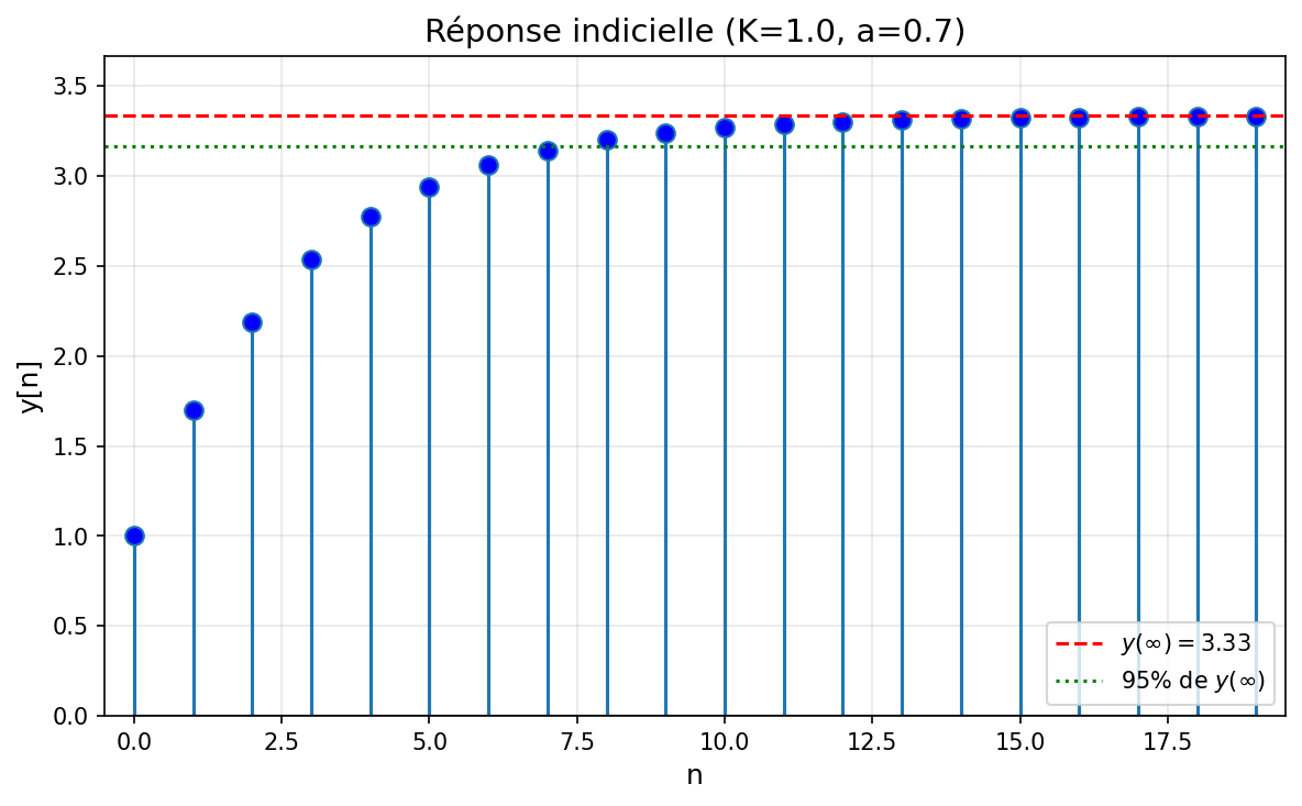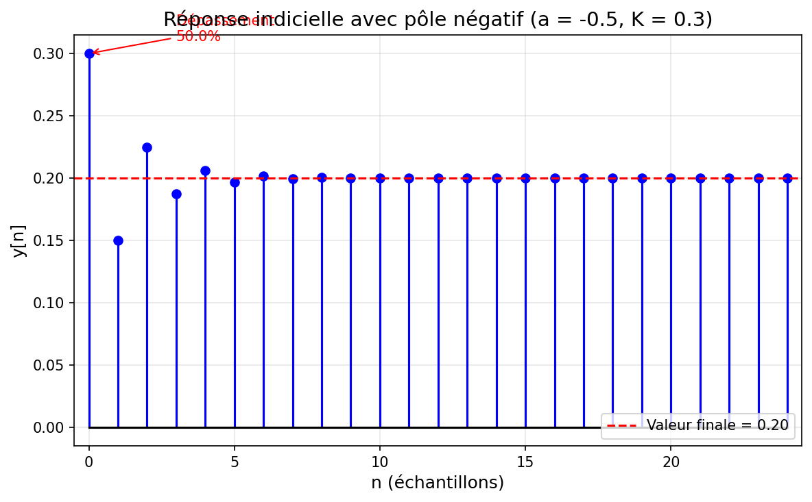 Cette section présente l'analyse systématique des systèmes discrets de premier ordre. Après la modélisation (équation de récurrence, fonction de transfert, pôles/zéros), on étudie les réponses temporelles : impulsionnelle et indicielle. Les propriétés caractéristiques (temps de réponse, valeur finale) sont détaillées pour les cas d'un pôle positif et d'un pôle négatif.